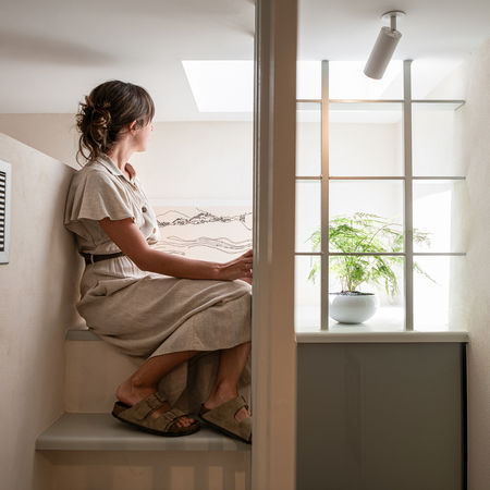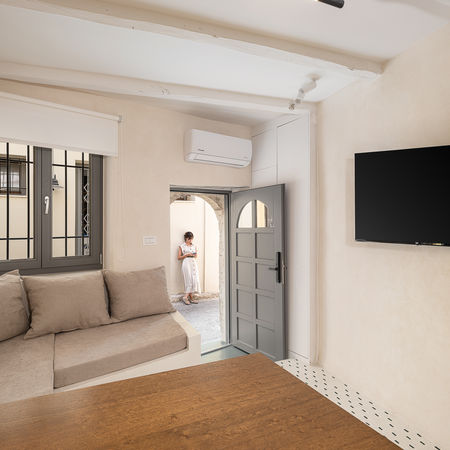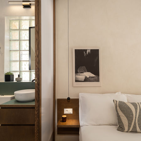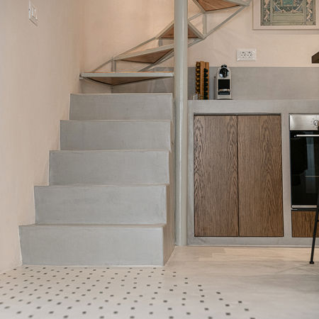 This project reimagines a historic Venetian structure with a refined modern vocabulary. Through careful preservation and thoughtful spatial interventions, the building’s limited footprint is transformed into a functional, layered space that feels both contemporary and timeless. The three-level residence, spanning just 24 sq m, retains its original Venetian shell and later structural additions, including a striking iron revolving staircase. Externally, the historic character has been maintained, with new wooden frames crafted in soft olive tones to echo the original detailing. Inside, the design emphasizes fluidity and space-saving precision. The kitchen and living areas are conceived as fixed, sculptural elements coated in cement mortar, creating a seamless visual flow. The ground floor is finished in the same material, its surface inlaid with sunken green glass mosaics that subtly guide the path upward. Two compact bedrooms and bathrooms occupy the upper levels, divided by wooden partitions framed with transparent plexiglass panels. These elements balance privacy with an airy sense of openness, enhancing the vertical connection between floors. The project’s guiding principle was to make every centimeter count while allowing the building’s historical atmosphere to resonate.